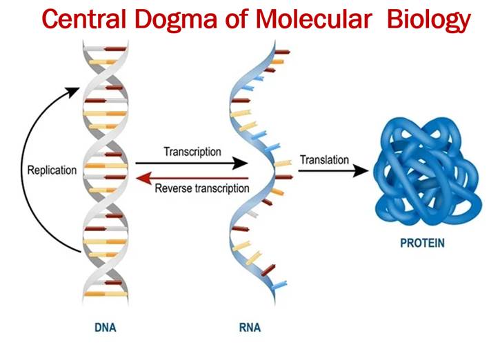 ✔ DNA RNA → Protein (Replication → Transcription → Translation).