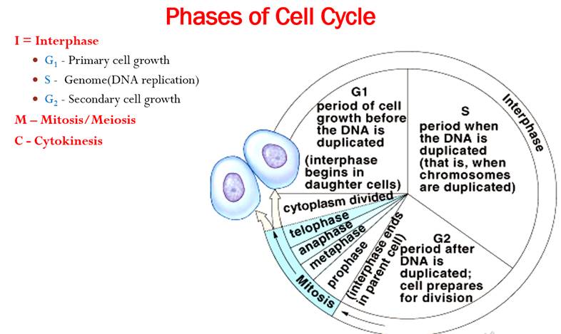 Cell Cycle → Interphase → Mitosis/Meiosis → Cytokinesis